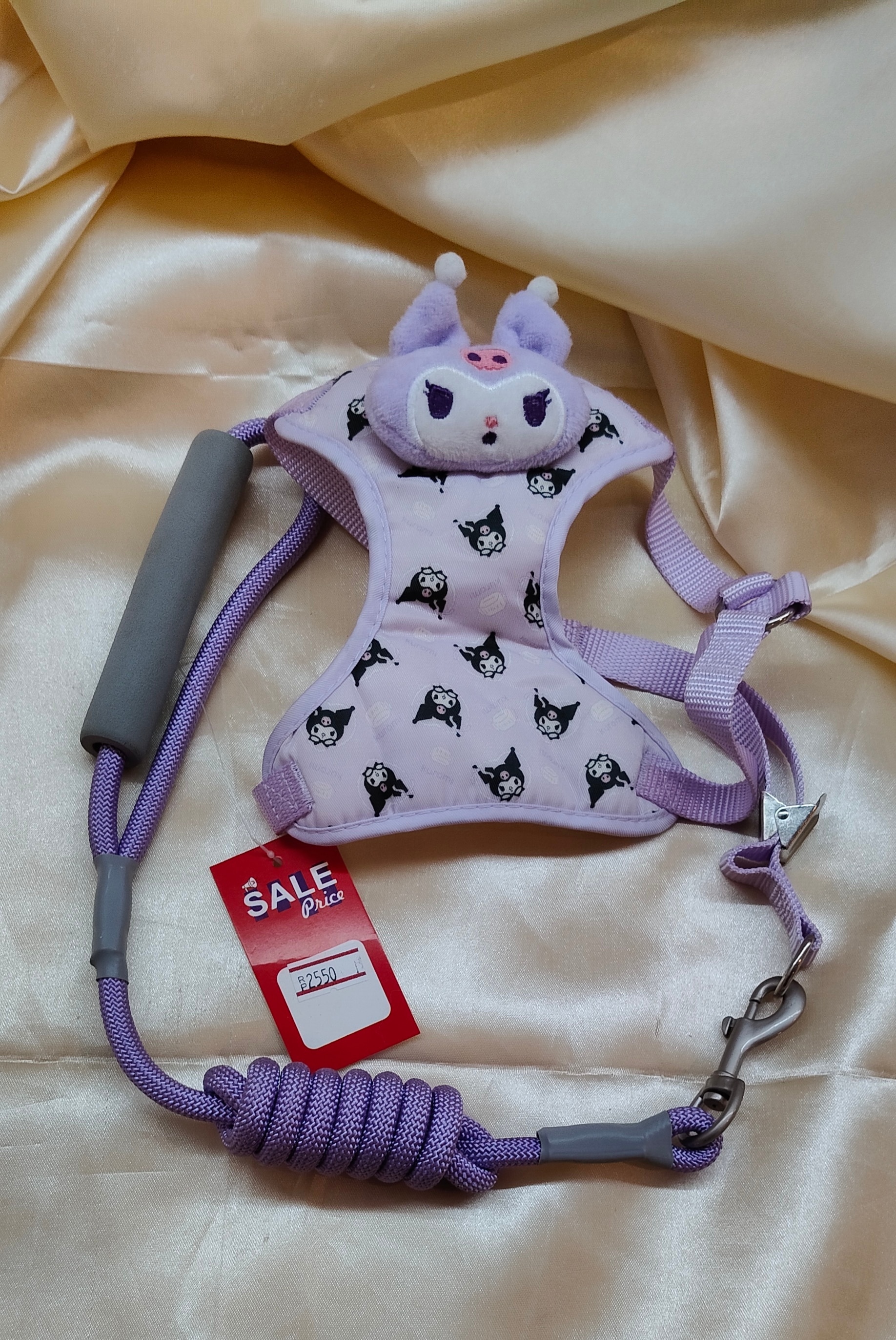 The Kuromi Character Pet Harness & Rope Leash Set brings playful style to your pet’s walks. The harness features an adorable Kuromi plush head on top and a printed fabric with mini Kuromi faces, made from soft padded material for comfort and safety. The adjustable straps provide a secure fit without restricting movement. Paired with a matching purple rope-style leash that includes a cushioned foam handle for a comfortable grip. Durable stitching and a strong metal clip ensure safety during everyday walks and outings.