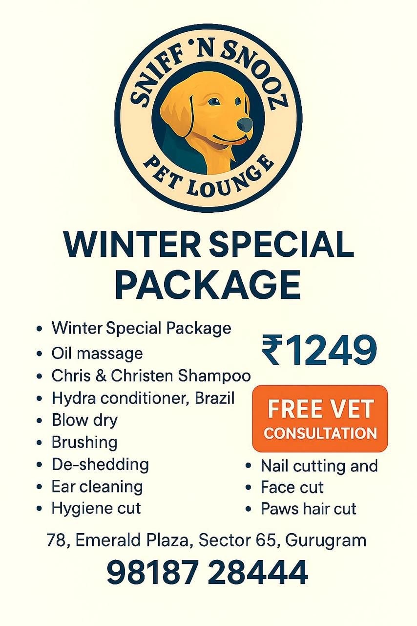 ❄️ Winter Special – No-Dandruff Grooming Package Give your pet the warm, soothing, and dandruff-free winter care they truly deserve! At Sniff n Snooz Pet Grooming, our Winter Special No-Dandruff Package is designed to deeply nourish the skin, restore coat shine, and keep your furry baby comfortable throughout the cold season. ✨ What’s Included in This Premium Winter Care Package? 🐾 Nourishing Oil Massage A gentle, enriching pre-bath oil massage that boosts blood circulation, hydrates dry winter skin, and reduces flakiness from the roots. 🐾 Anti-Dandruff Bathing A specialised winter-friendly shampoo that treats dryness, controls dandruff, and maintains healthy skin without stripping natural oils. 🐾 Deep Conditioner Treatment A smoothing conditioner that locks in moisture, softens the coat, and protects against winter roughness. 🐾 Warm Blow Dry A comforting and safe blow dry to prevent chills while giving the coat a smooth, fluffy finish. 🐾 Anal Gland Clearing Hygienic and essential care to ensure your pet’s comfort and prevent irritation. 🐾 Second Blow Dry for Perfect Finish A final warm blow dry to fluff up the coat for a beautifully styled winter look. 🐾 Brushing & De-Shedding Removes loose fur, untangles the coat, and keeps shedding under control — ideal for winter coat maintenance. ⸻ 💙 Why Choose This Package? ✔️ Perfect for pets with dry skin or visible dandruff ✔️ Deep hydration + dandruff removal ✔️ Strengthens coat and enhances winter shine ✔️ Ensures complete hygiene and comfort ✔️ Ideal winter season grooming for all breeds