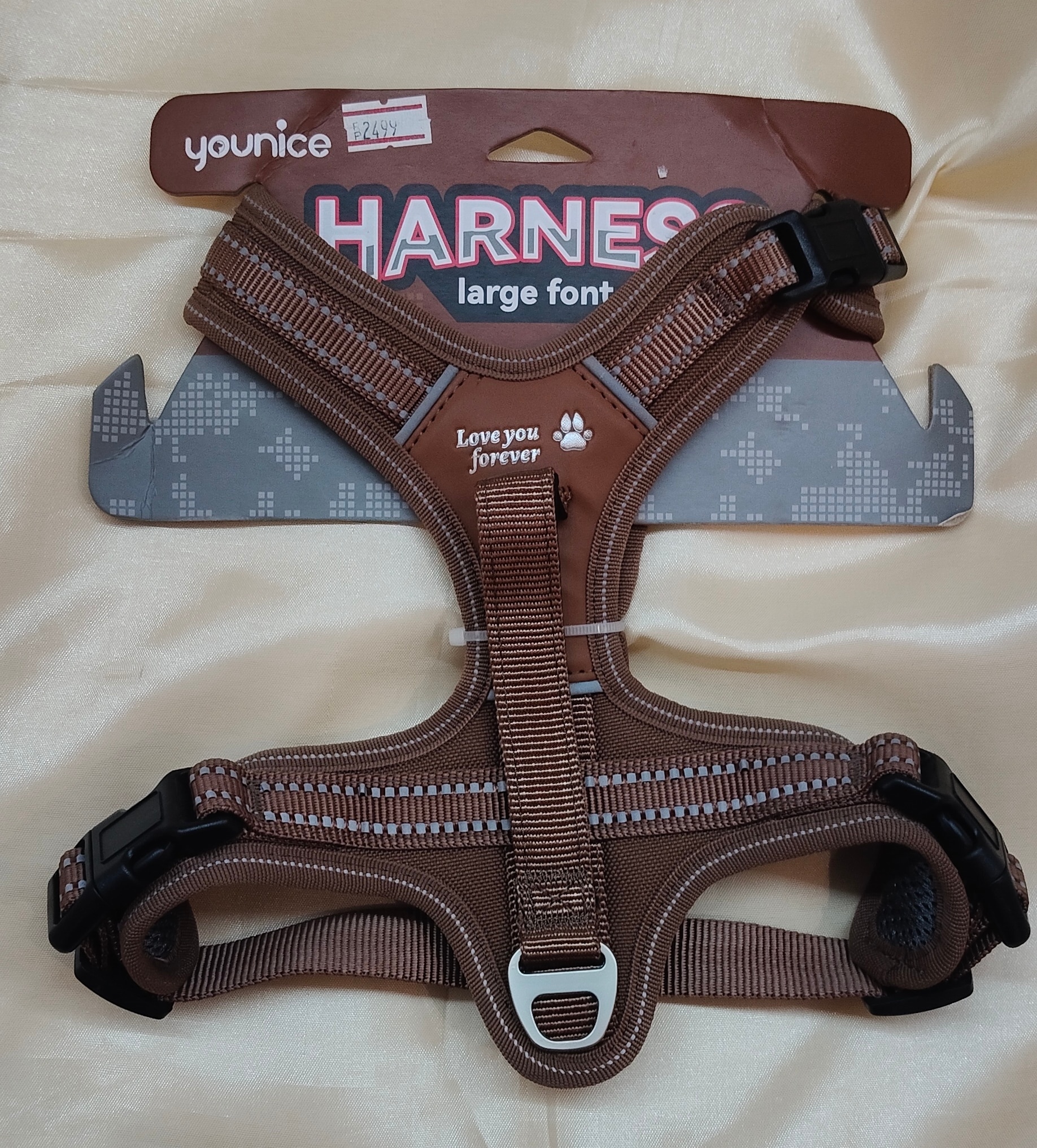 The Younice Adjustable Brown Pet Harness is designed for comfort, durability, and safety for medium to large dogs. Made from high-quality nylon webbing with reflective stitching, it enhances nighttime visibility. The padded interior reduces strain on the chest, while the easy-snap buckles allow quick on-and-off use. The harness features an embroidered "Love you forever" paw motif and a sturdy metal D-ring for leash attachment. Suitable for daily walks, training, and outdoor activities.
