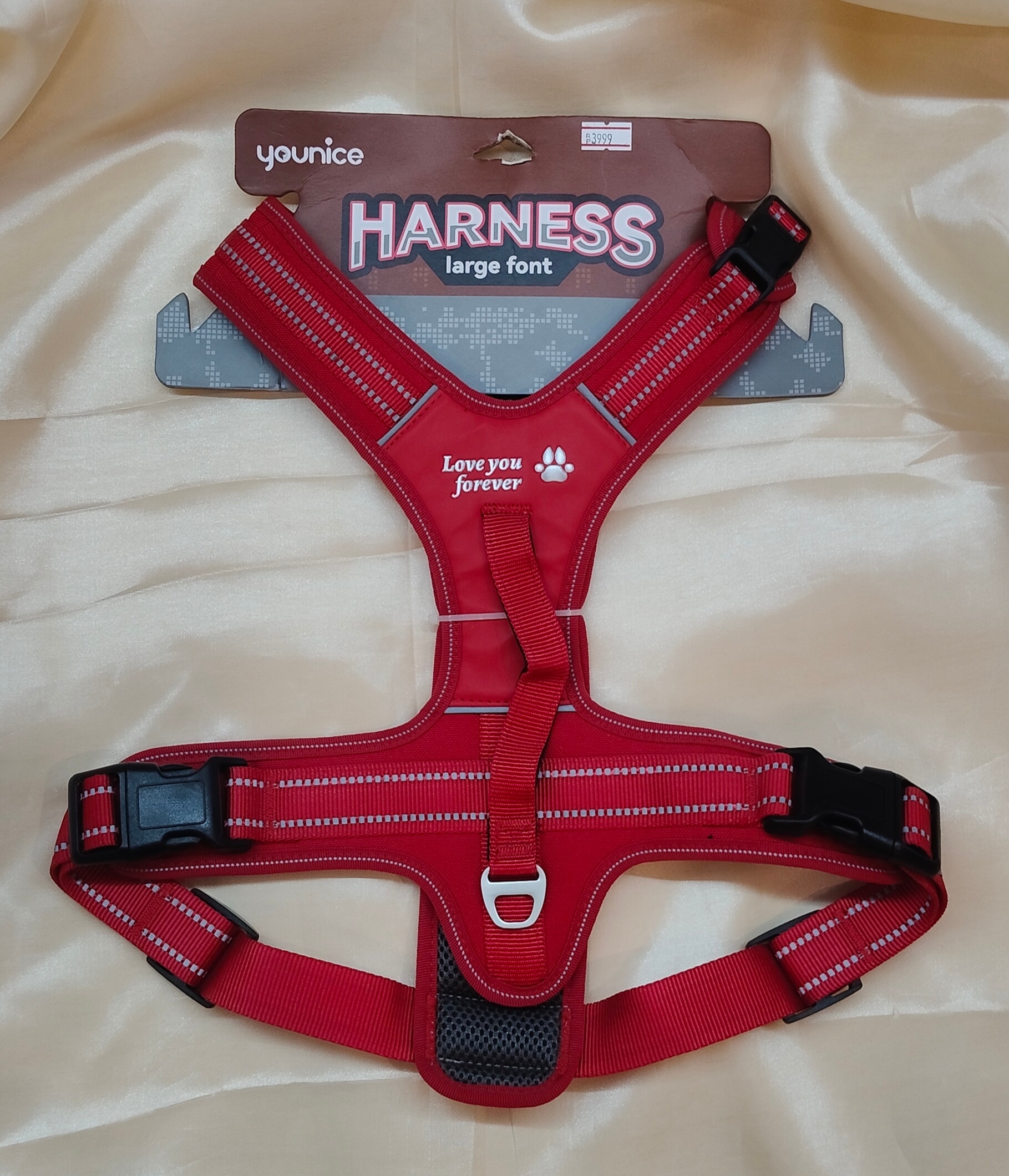 The Younice Adjustable Red Pet Harness is designed for comfort, durability, and safety for medium to large dogs. Made with nylon webbing and reflective stitching, it ensures visibility during nighttime walks. The padded chest panel distributes pressure evenly to prevent choking, while quick-release buckles make it easy to put on and remove. A strong metal D-ring provides secure leash attachment. Stylishly finished with the "Love You Forever" paw motif.